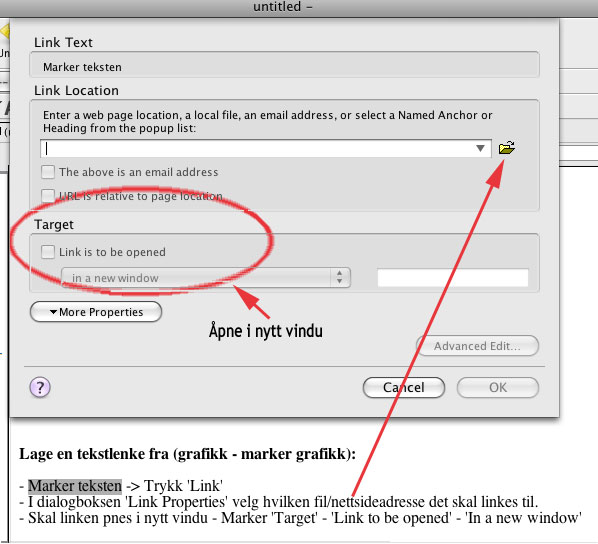 skal åpnes i nytt vindu velg 'Target' - 'Link to be opened' 'in new